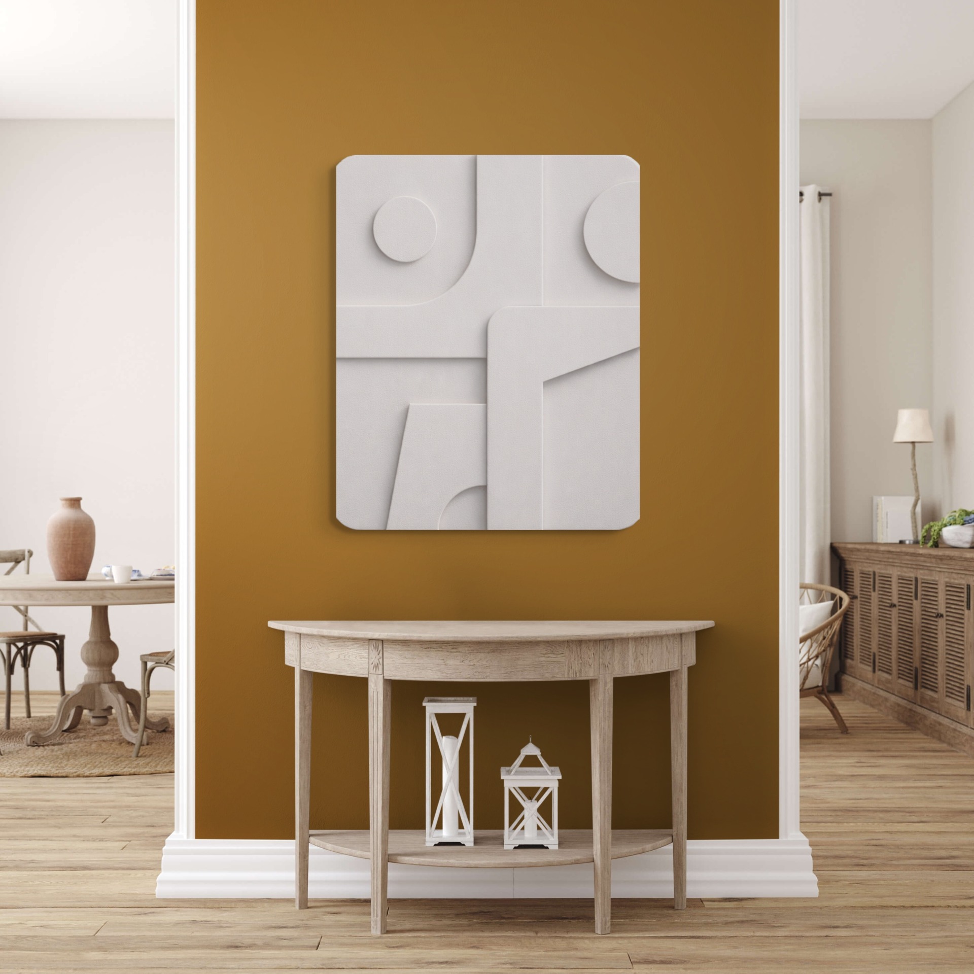 Κάθε πάνελ δημιουργείται με συνδυασμό τεχνικών επάλληλης ξυλουργικής MDF ή μασίφ ξύλο και ακριβούς χάραξης CNC, επιτρέποντας την απόδοση ομαλών γεωμετρικών ανάγλυφων, καμπύλων και γλυπτικής αίσθησης βάθους.